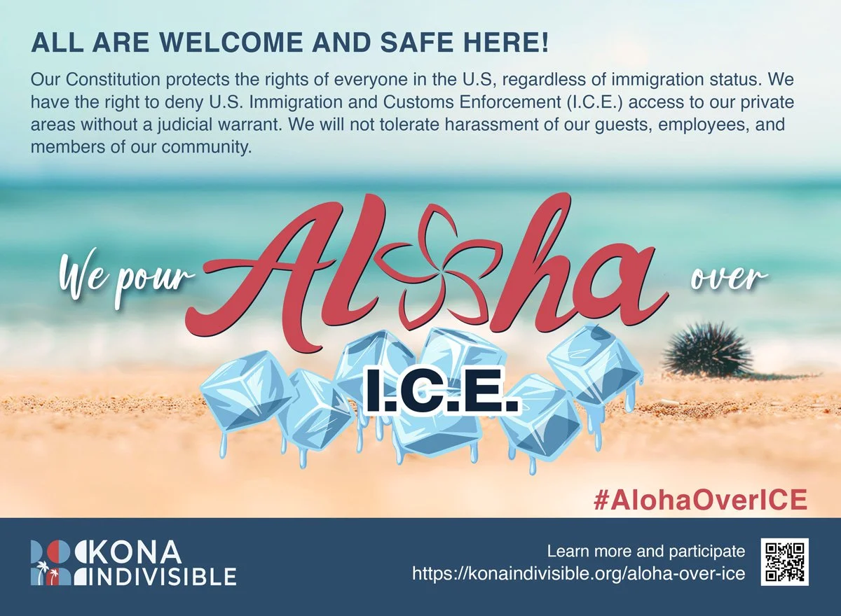 Share the flyer on your social accounts (Facebook, BlueSky, Instagram, or TikTok) with the hashtag #AlohaOverICE!