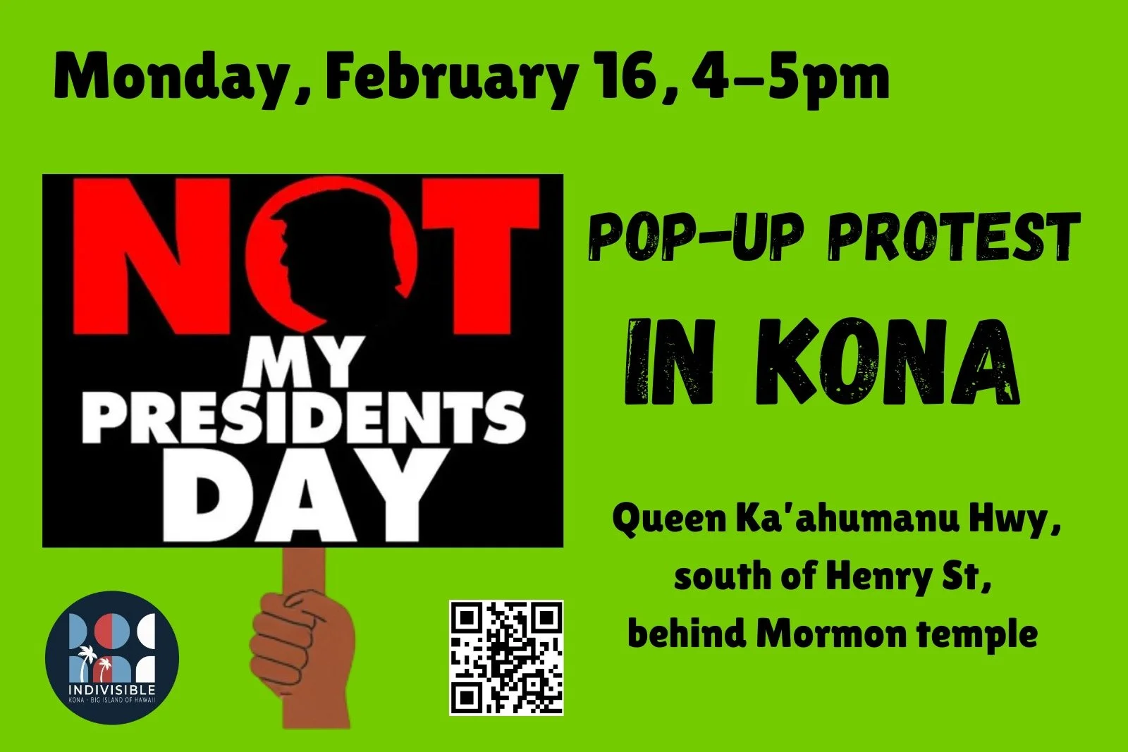 When: Monday, February 16, 2026, from 4:00-5:00 pm at the usual protest spot